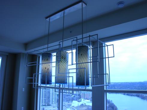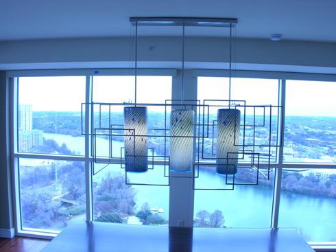 Commissioned Chandelier for private residence: 3 steel blue blown glass